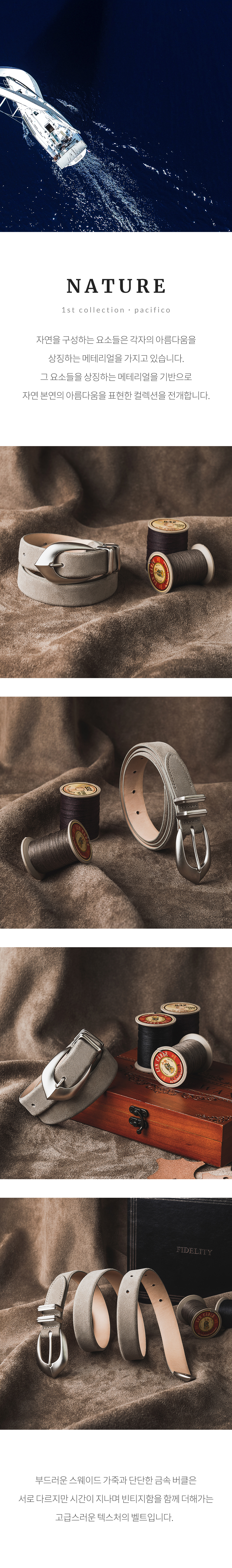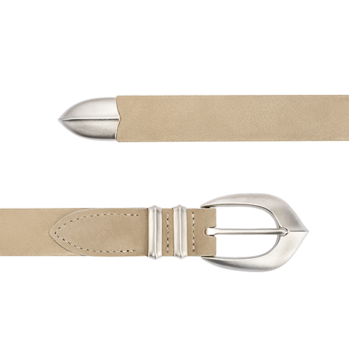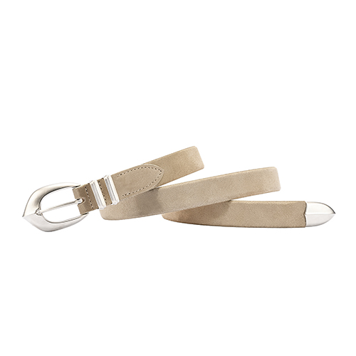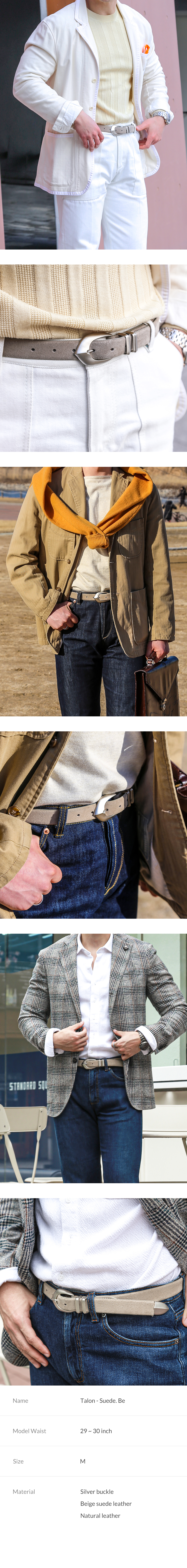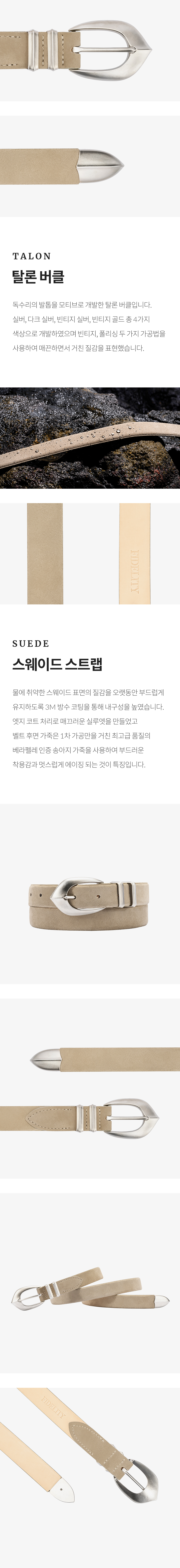 부드러운 스웨이드 가죽과 단단한 금속 버클은 서로 다르지만 시간이 지나며 빈티지함을 함께 더해가는 고급스러운 텍스처의 벨트입니다.