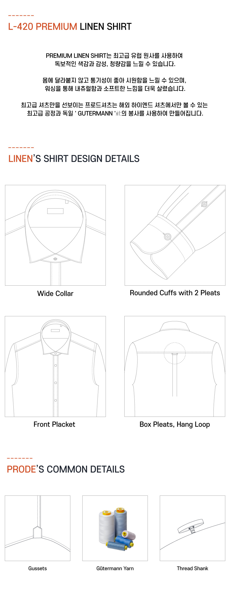 최고급 셔츠만을 선보이는 프로드셔츠는 해외 하이엔드 셔츠에서만 볼 수 있는 최고급 공정과 독일 'GUTERMANN' 社의 봉사를 사용하여 만들어집니다.