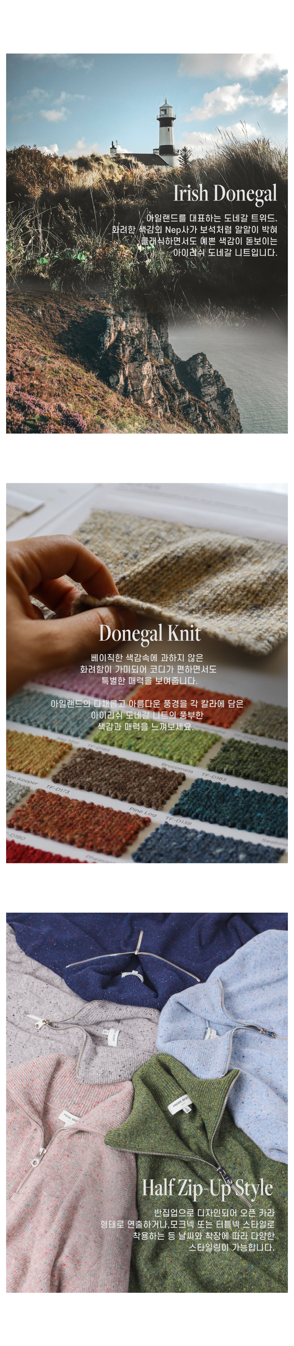 아일랜드의 다채롭고 아름다운 풍경을 각 칼라에 담은 아이리쉬 도네갈 반집업 니트의 풍부한 색감과 매력을 느껴보세요.