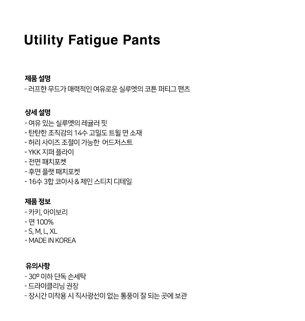러프한 무드가 매력적인 여유로운 실루엣의 코튼 퍼티그 팬츠