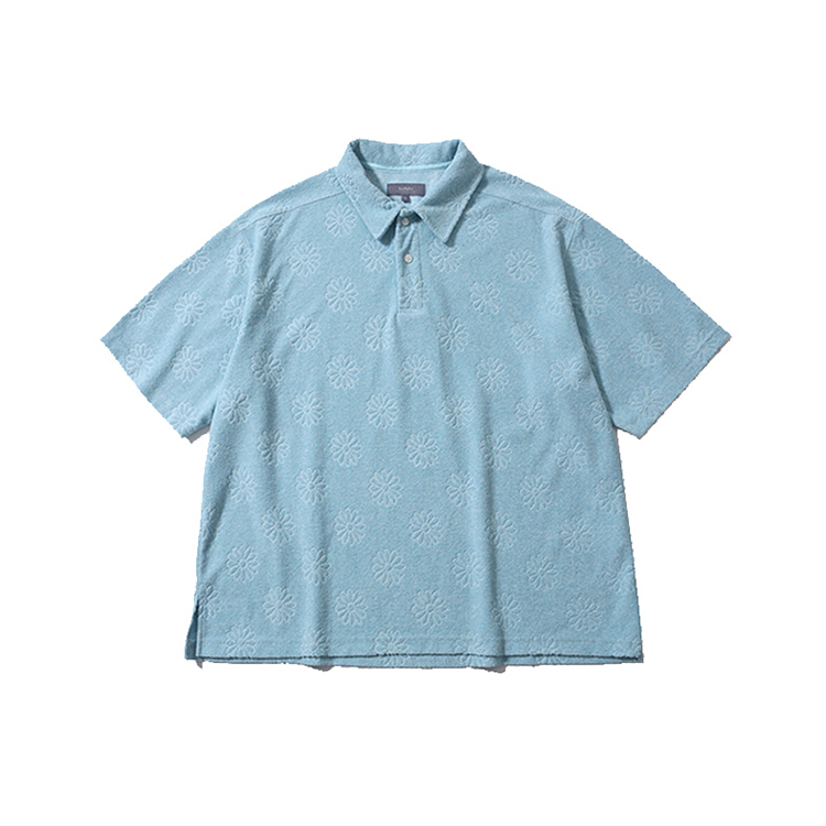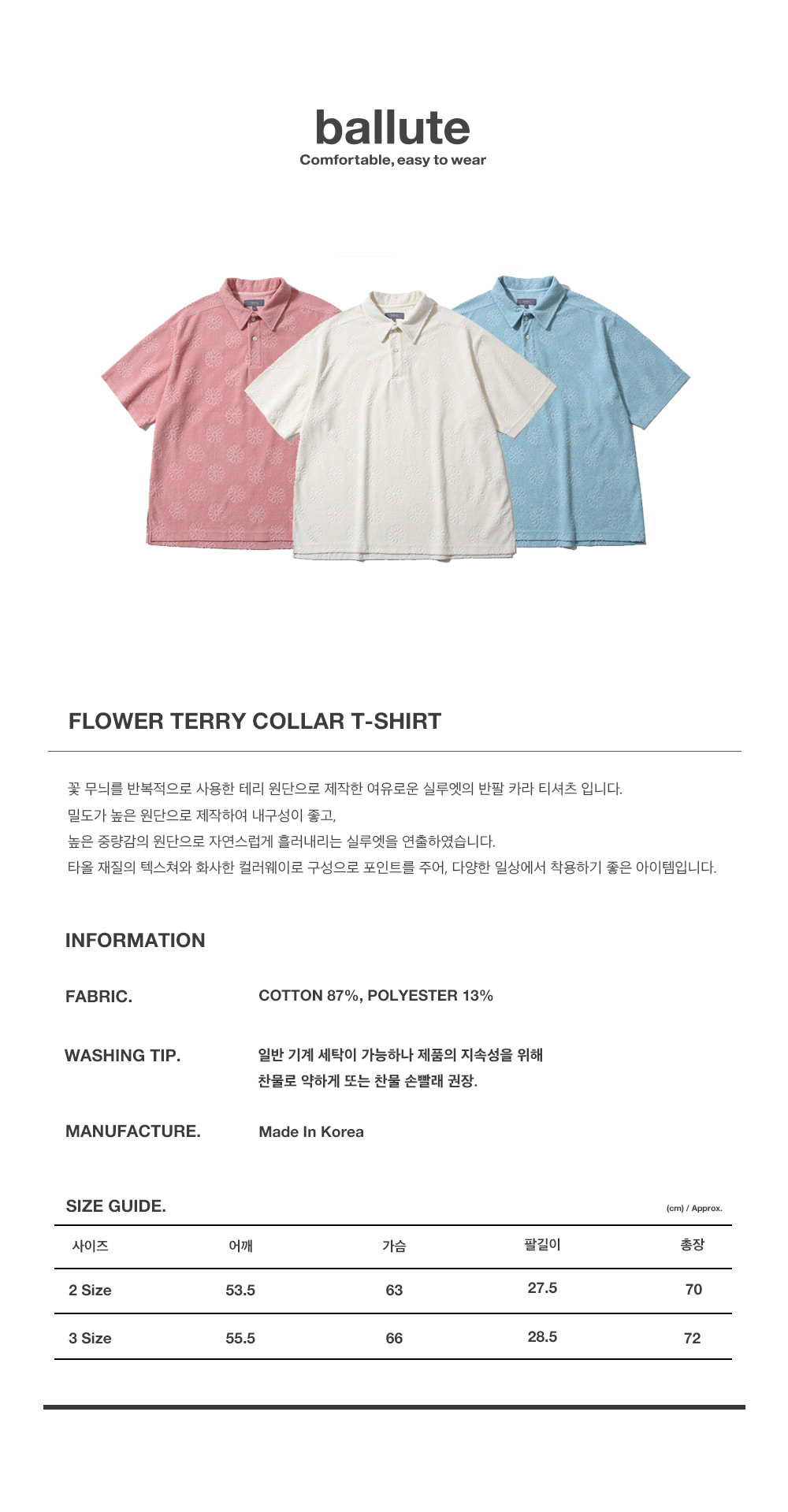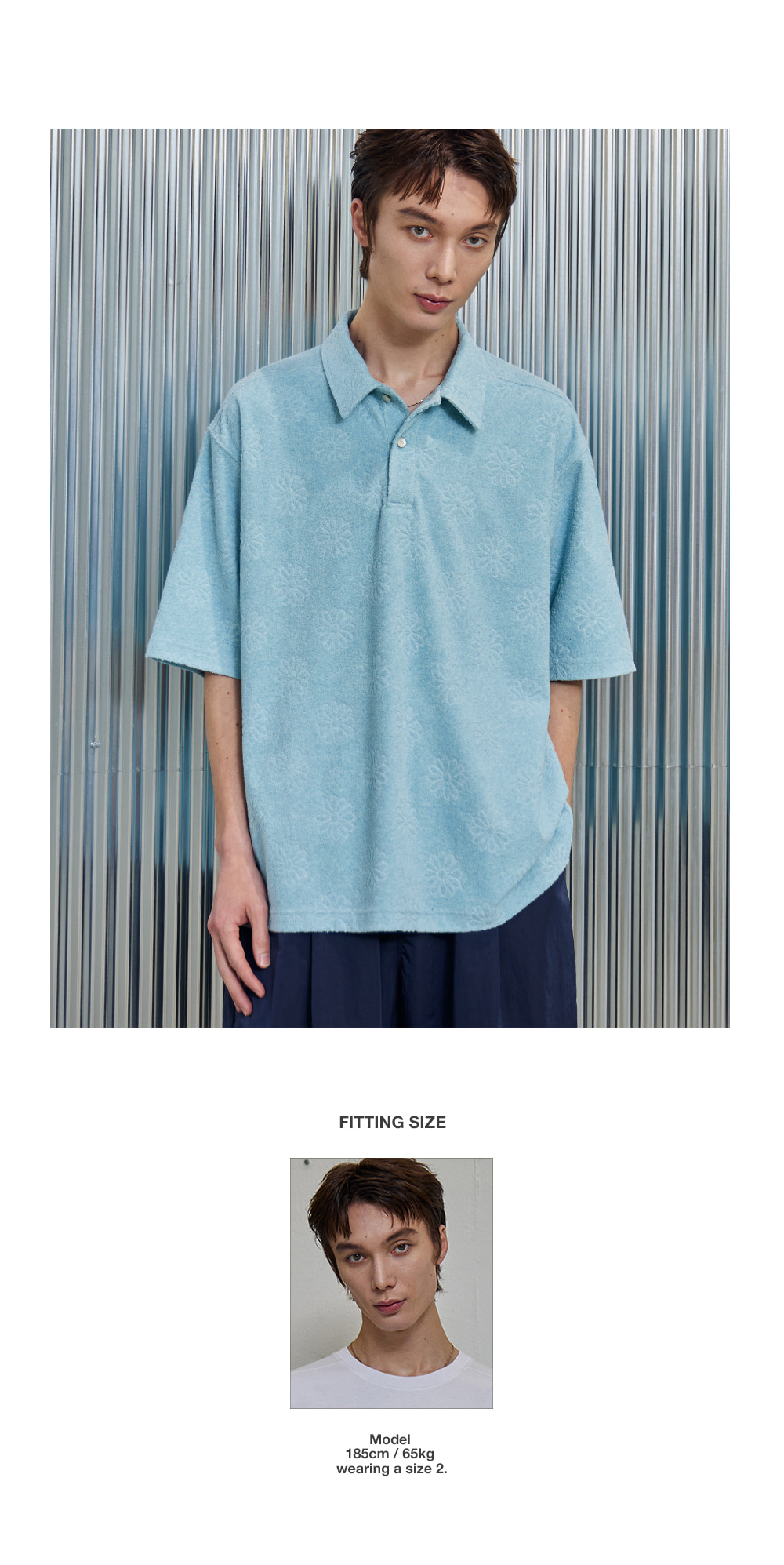 꽃무늬를 반복적으로 사용한 테리 원단으로 제작한 여유로운 실루엣의 반팔 카라 티셔츠입니다. 밀도가 높은 원단으로 제작하여 내구성이 좋고, 높은 중량감의 원단으로 자연스럽게 흘러내리는 실루엣을 연출하였습니다. 타월 재질의 텍스처와 화사한 컬러웨이 구성으로 포인트를 주어, 다양한 일상에서 착용하기 좋은 아이템입니다.