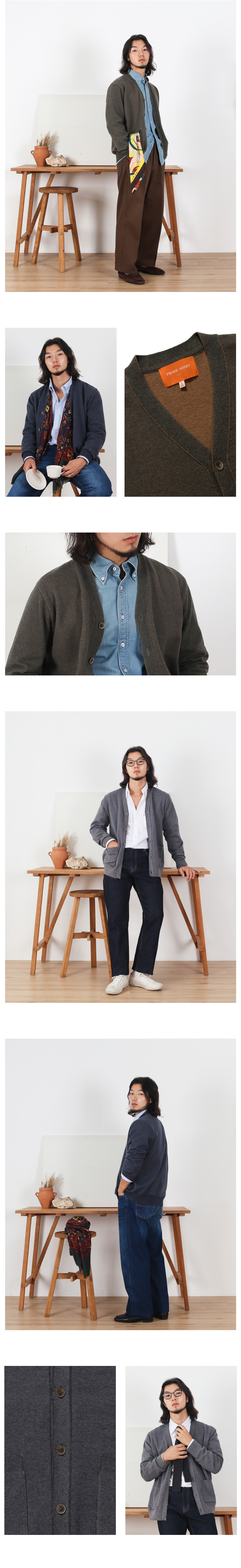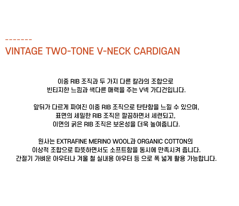 이중 RIB 조직과 두 가지 다른 칼라의 조합으로 빈티지한 느낌과 색다른 매력을 주는 V넥 가디건 입니다.