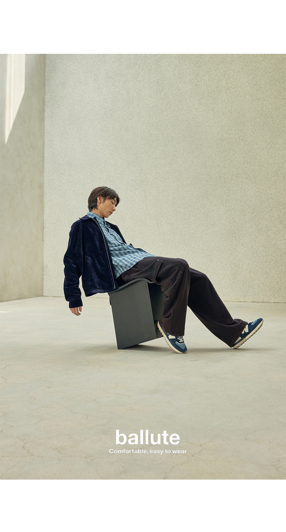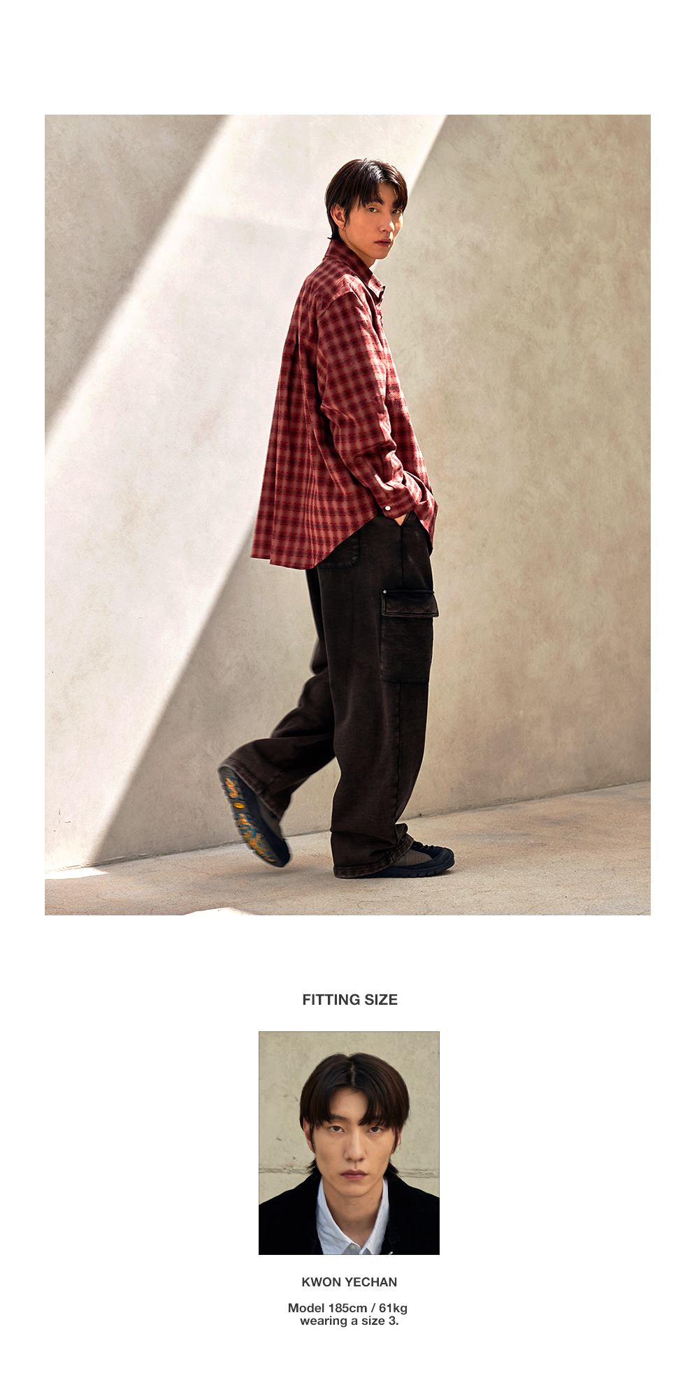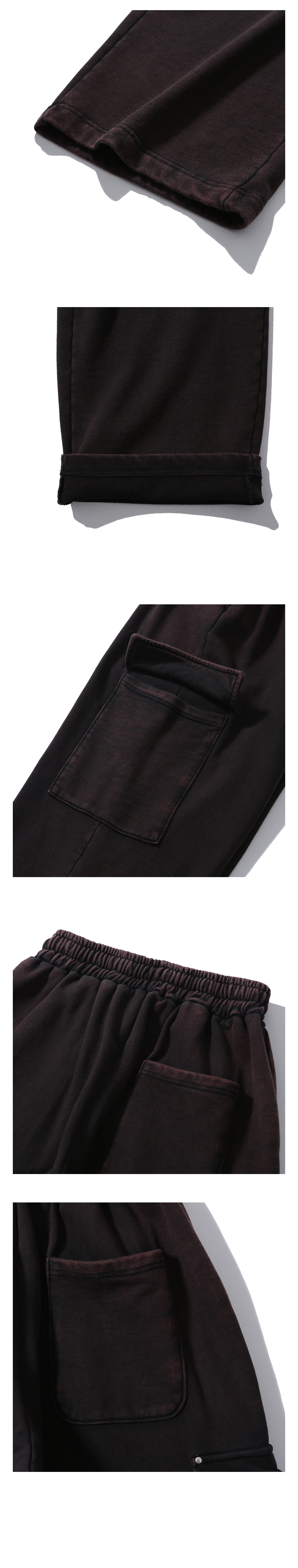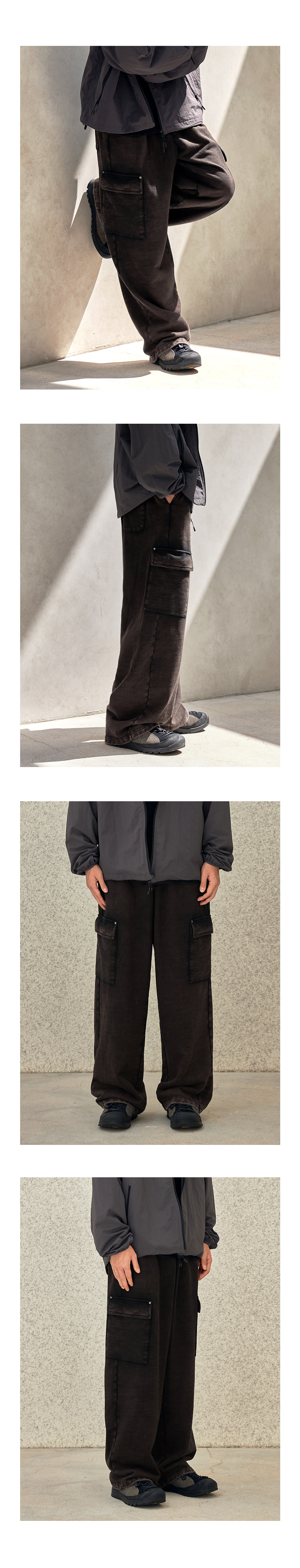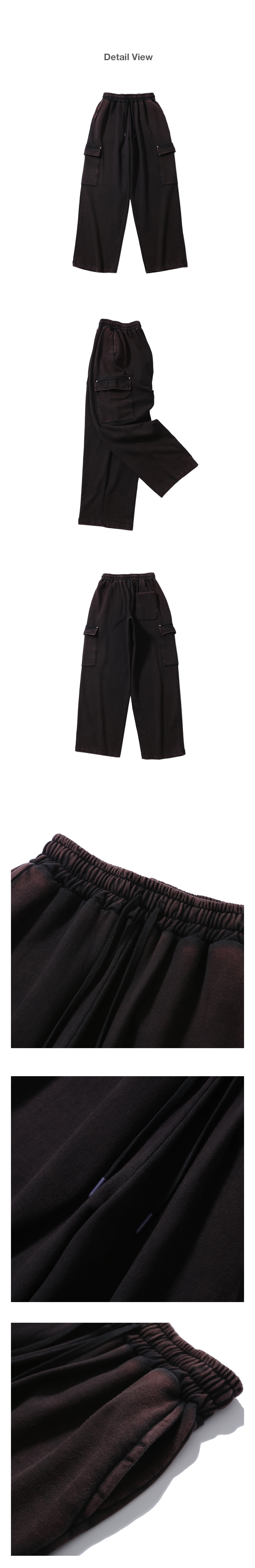 스퀘어 중량 440G의 고밀도 헤비쭈리 원단으로 제작하여 자연스럽게 흘러내리면서 쌓이는 실루엣의 카고 스웻 팬츠로 탈염 워싱을 통한 빈티지한 무드를 연출하였으며, 완성 작업에서 주머니 덮개 부분 리벳 작업으로 디테일을 추가하였습니다.