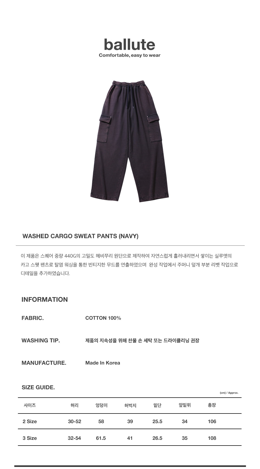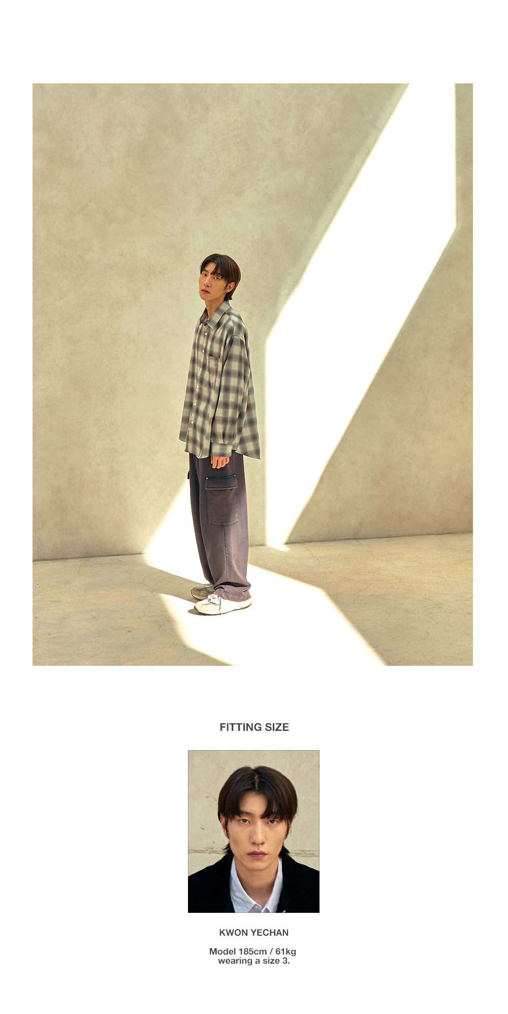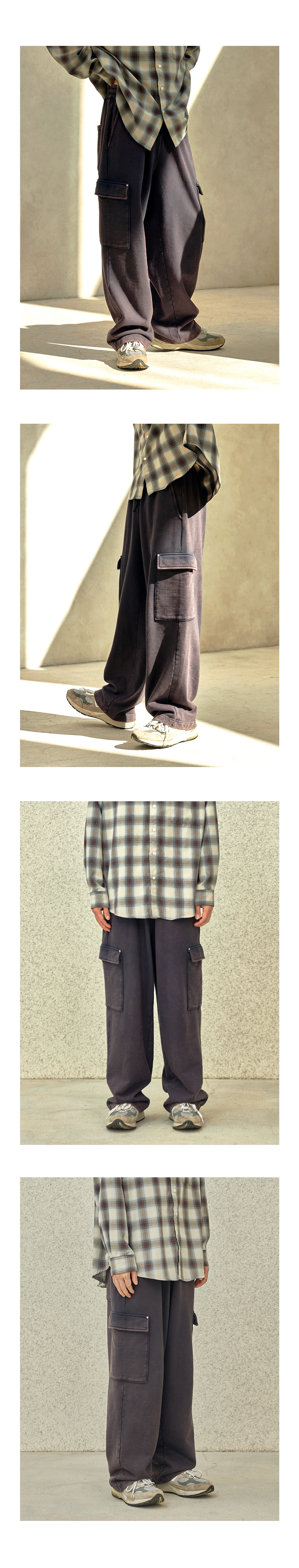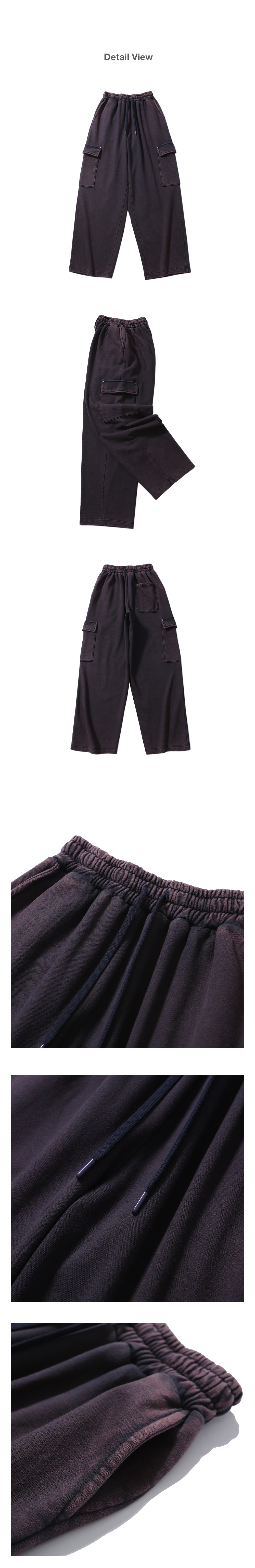 스퀘어 중량 440G의 고밀도 헤비쭈리 원단으로 제작하여 자연스럽게 흘러내리면서 쌓이는 실루엣의 카고 스웻 팬츠로 탈염 워싱을 통한 빈티지한 무드를 연출하였으며, 완성 작업에서 주머니 덮개 부분 리벳 작업으로 디테일을 추가하였습니다.
