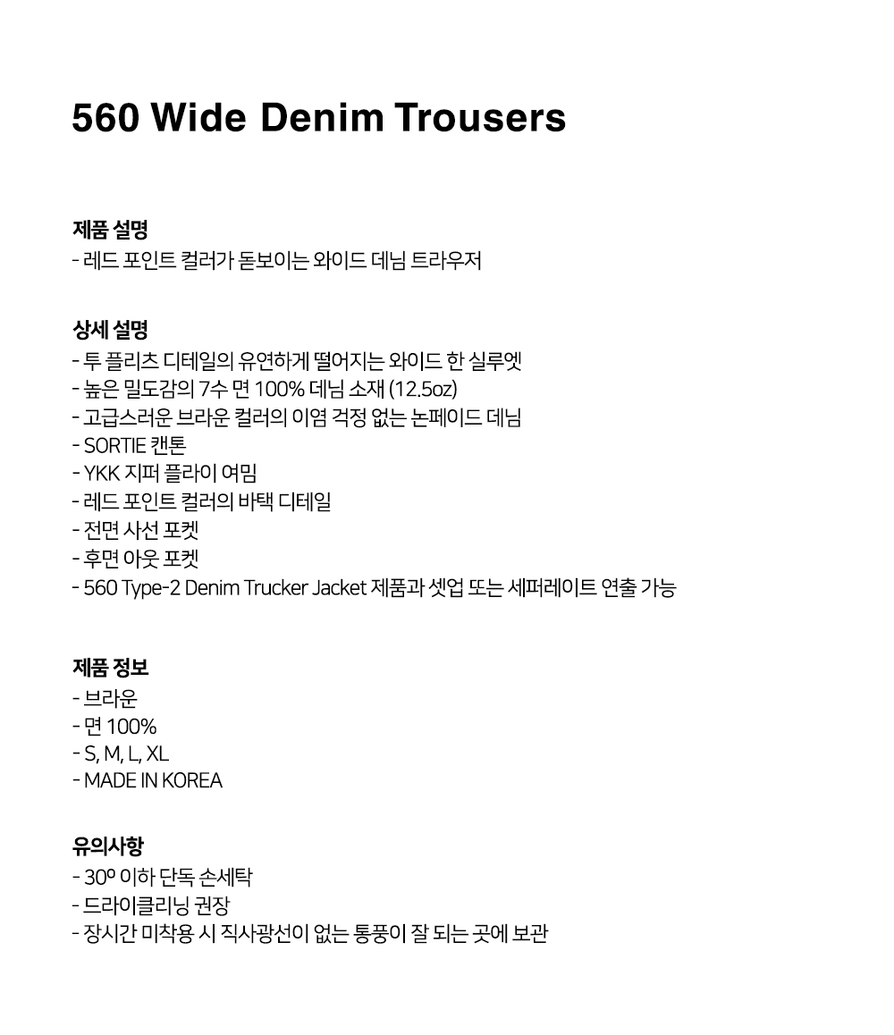 레드 포인트 컬러가 돋보이는 와이드 데님 트라우저