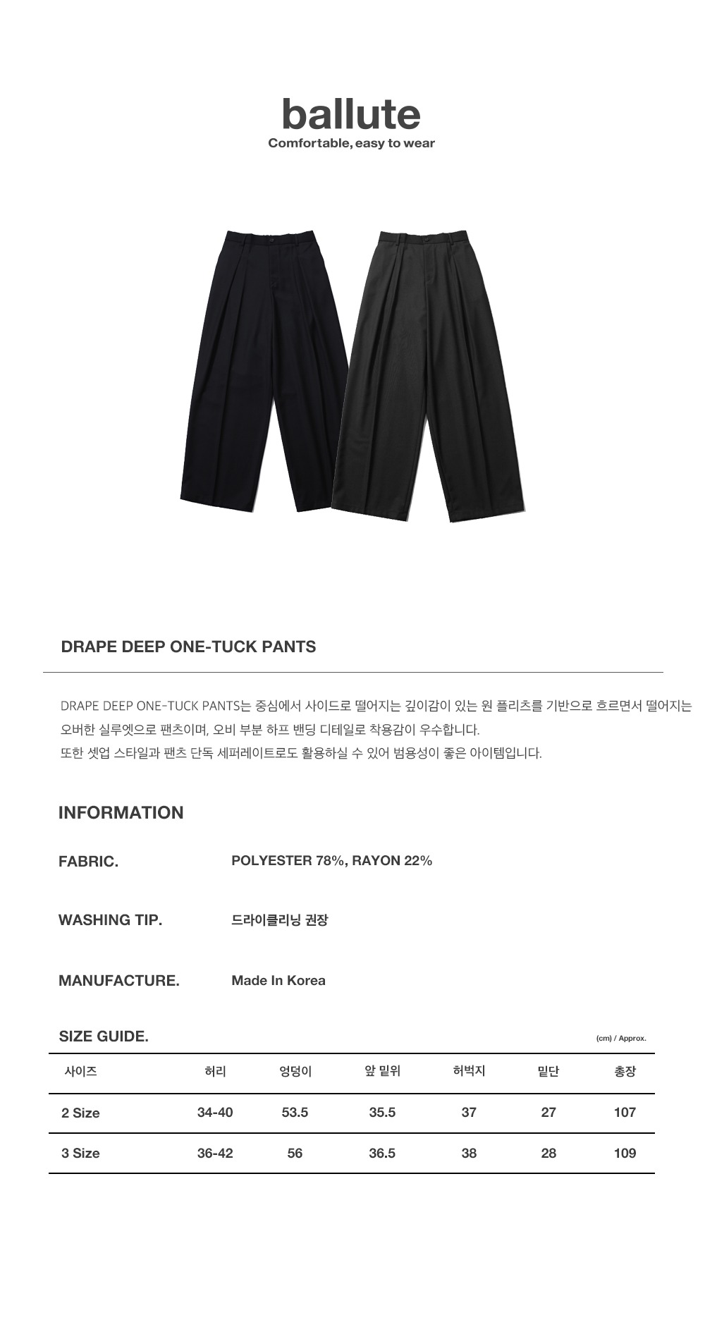 DRAPE DEEP ONE-TUCK PANTS는 중신에서 사이드로 떨어지는 깊이감이 있는 원 플리츠를 기반으로 떨어지는 오버한 실루엣 팬츠이며, 오비 부분 하프 밴딩 디테일로 착용감이 우수합니다.