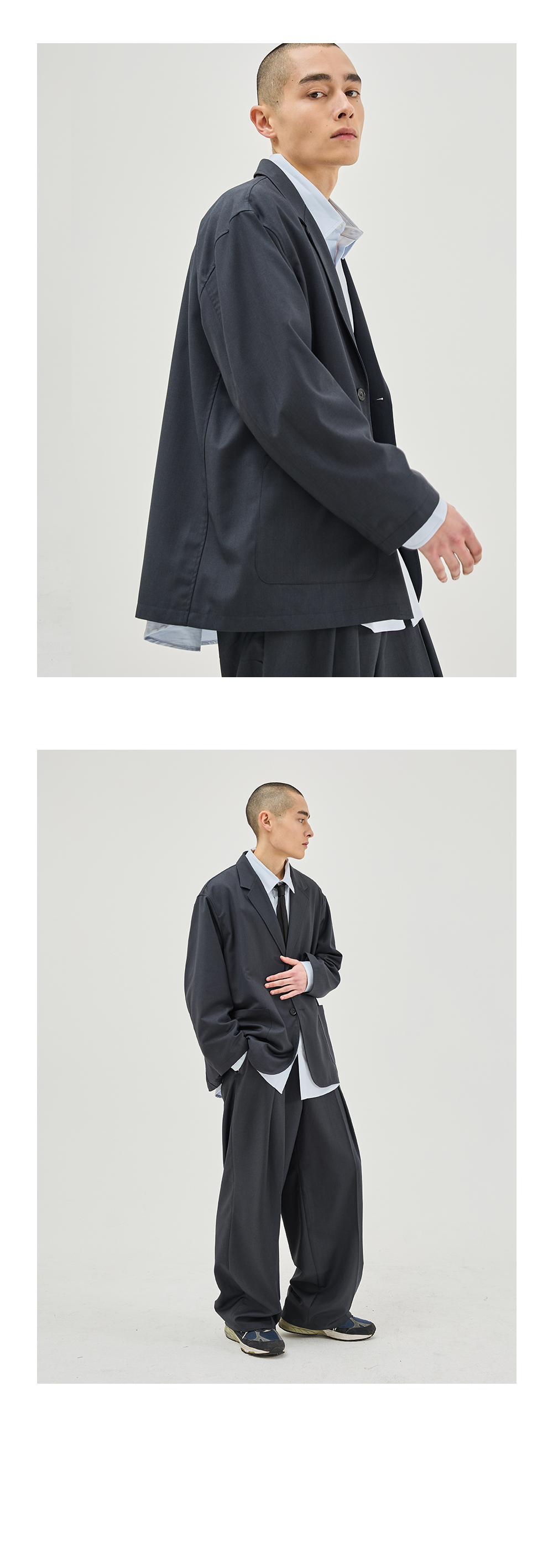 드레이프 오버 실루엣 자켓은 여유로운 품의 패턴으로 제작되었으며, 앞판 아웃포켓의 디테일로 클래식하면서 캐주얼한 무드를 주는 자켓입니다.