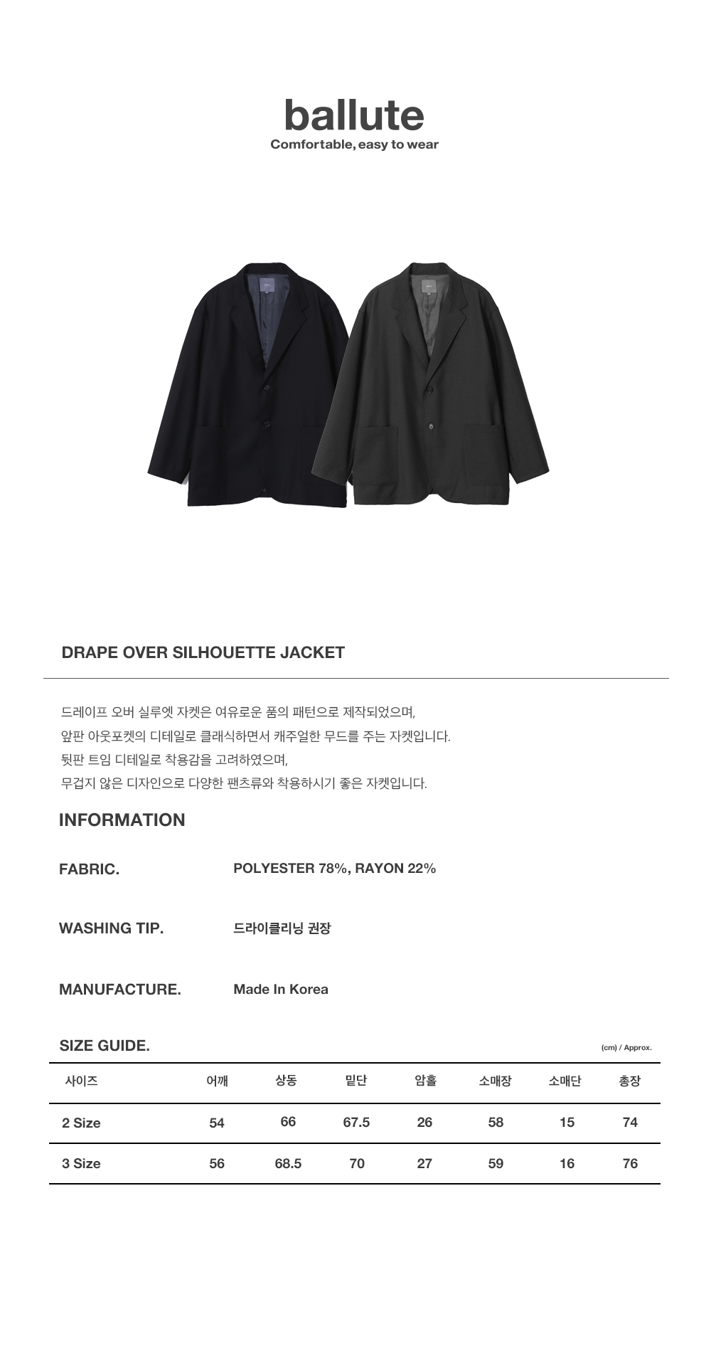 드레이프 오버 실루엣 자켓은 여유로운 품의 패턴으로 제작되었으며, 앞판 아웃포켓의 디테일로 클래식하면서 캐주얼한 무드를 주는 자켓입니다.