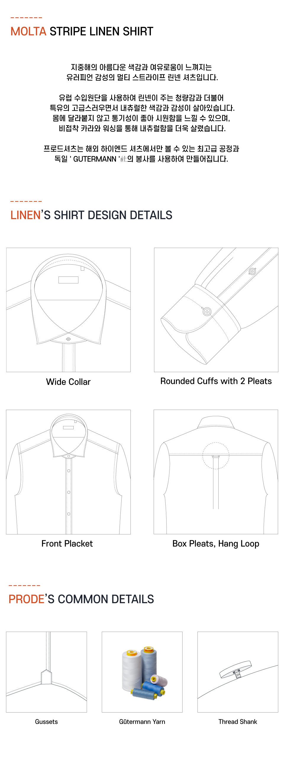 프로드셔츠는 해외 하이엔드 셔츠에서만 볼 수 있는 최고급 공정과 독일 'GUTERMANN' 社의 봉사를 사용하여 만들어집니다.