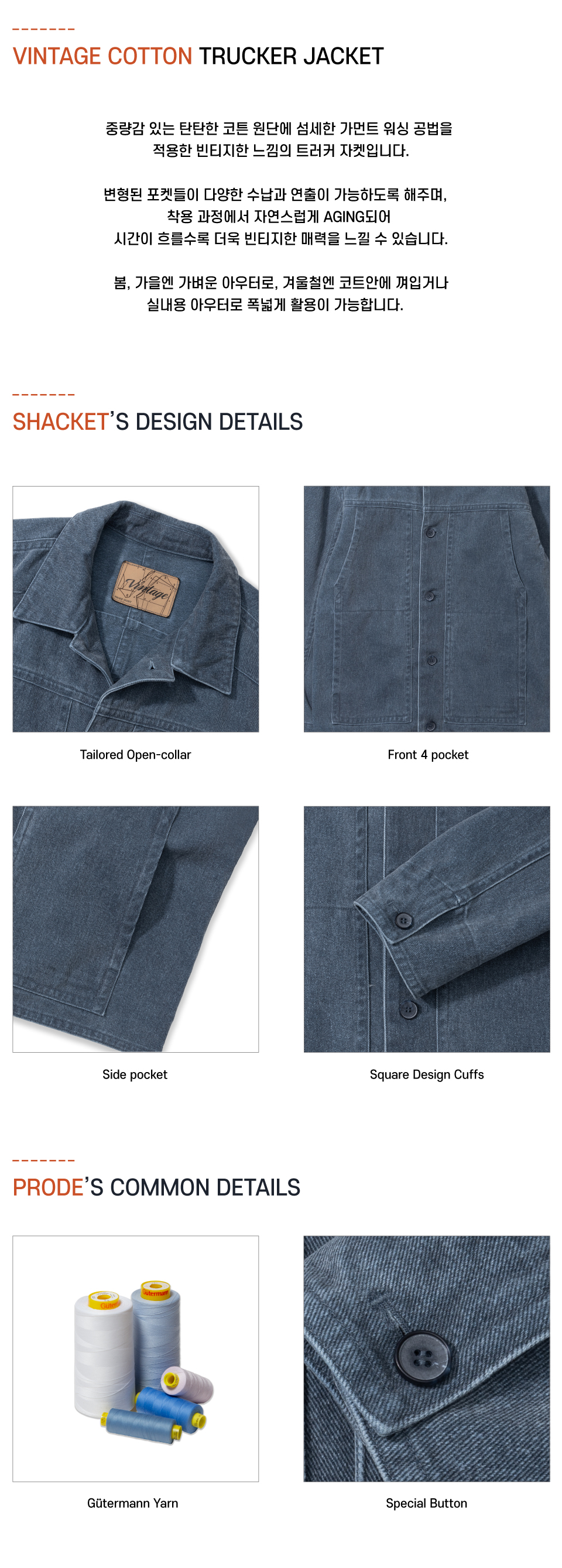 중량감 있는 탄탄한 코튼 원에 섬세한 가먼트 워싱 공법을 적용한 빈티지한 느낌의 트러커 자켓입니다.