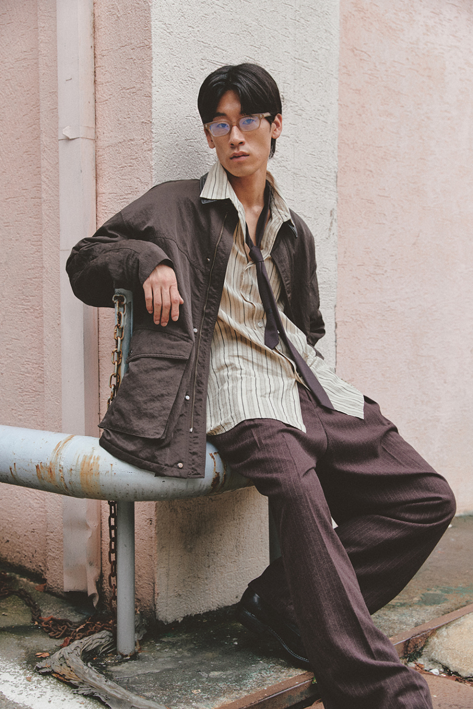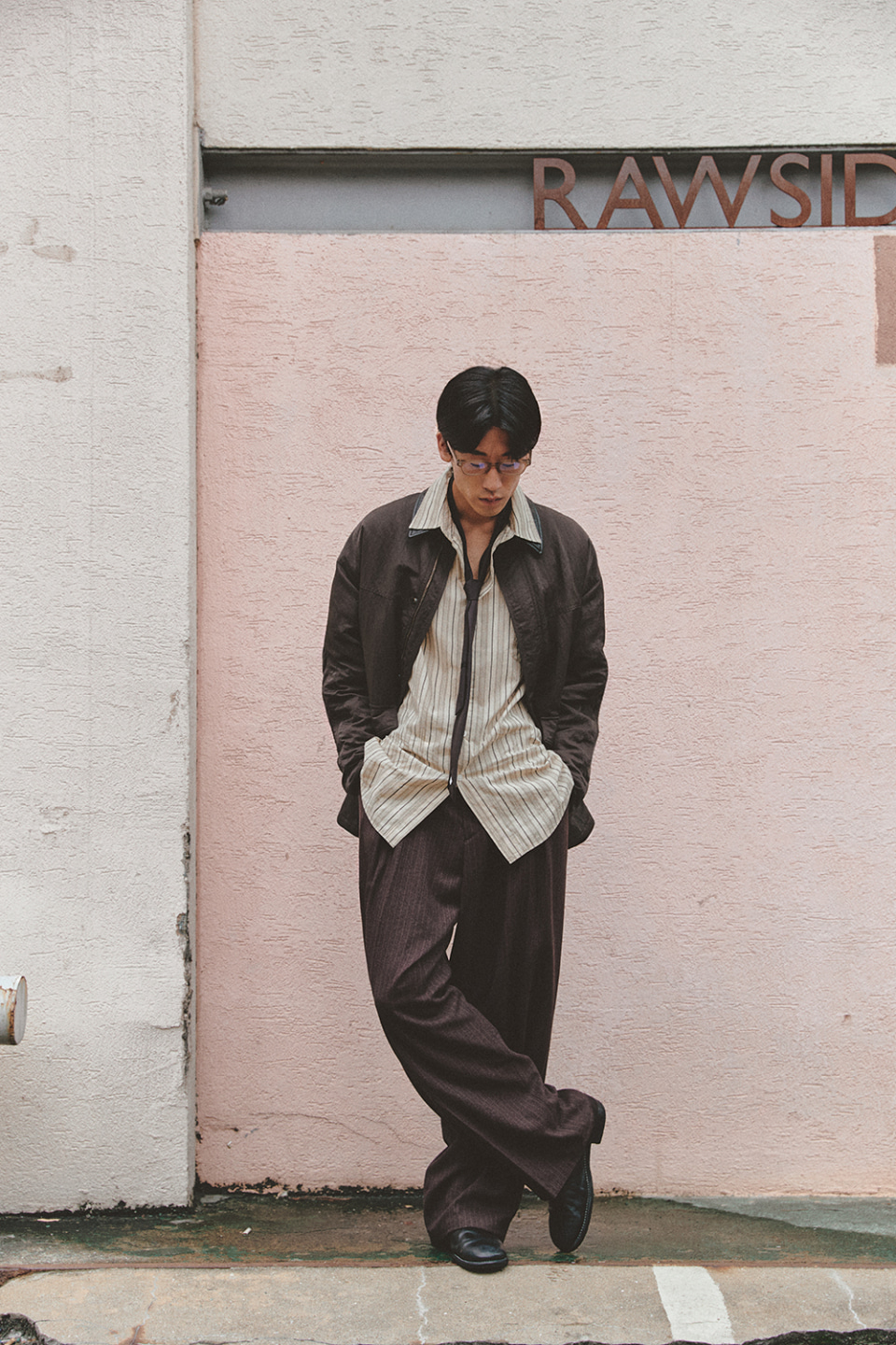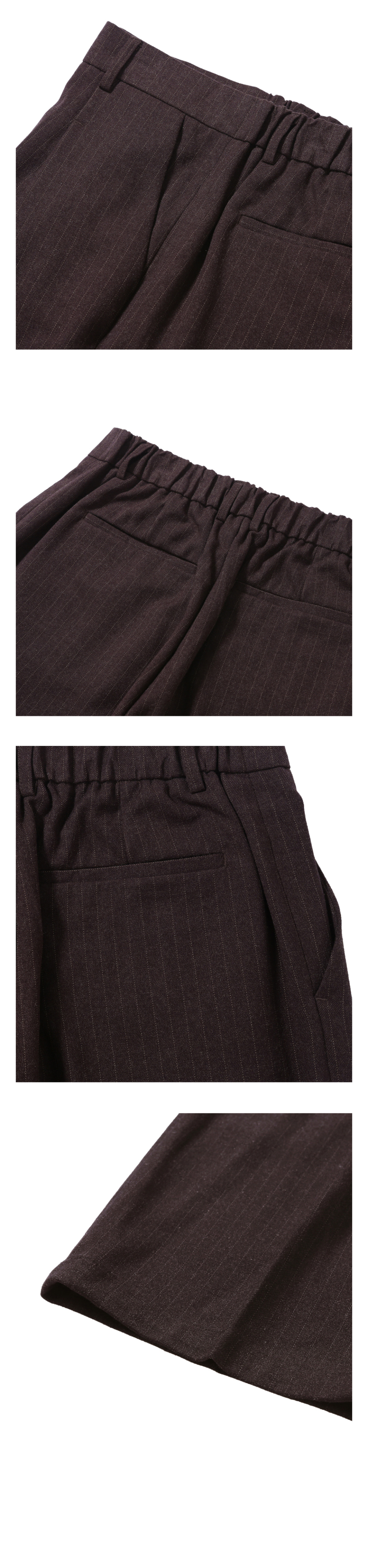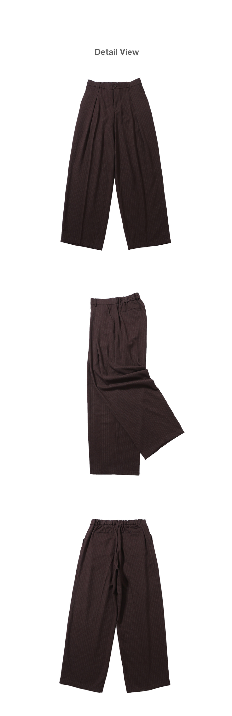 PIN STRIPE DEEP ONE TUCK PANTS 원 플리츠 기반으로 흐르면서 자연스레 연출되는 매력적인 실루엣을 가진 팬츠이며, 오비 부분 하프 밴딩 디테일로 착용감을 더했습니다.