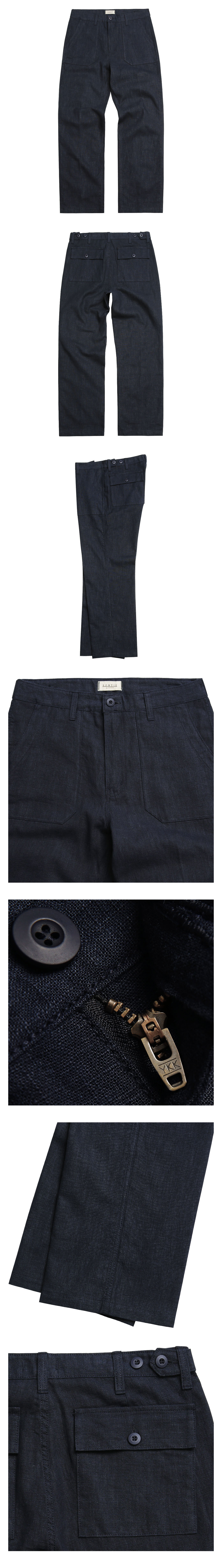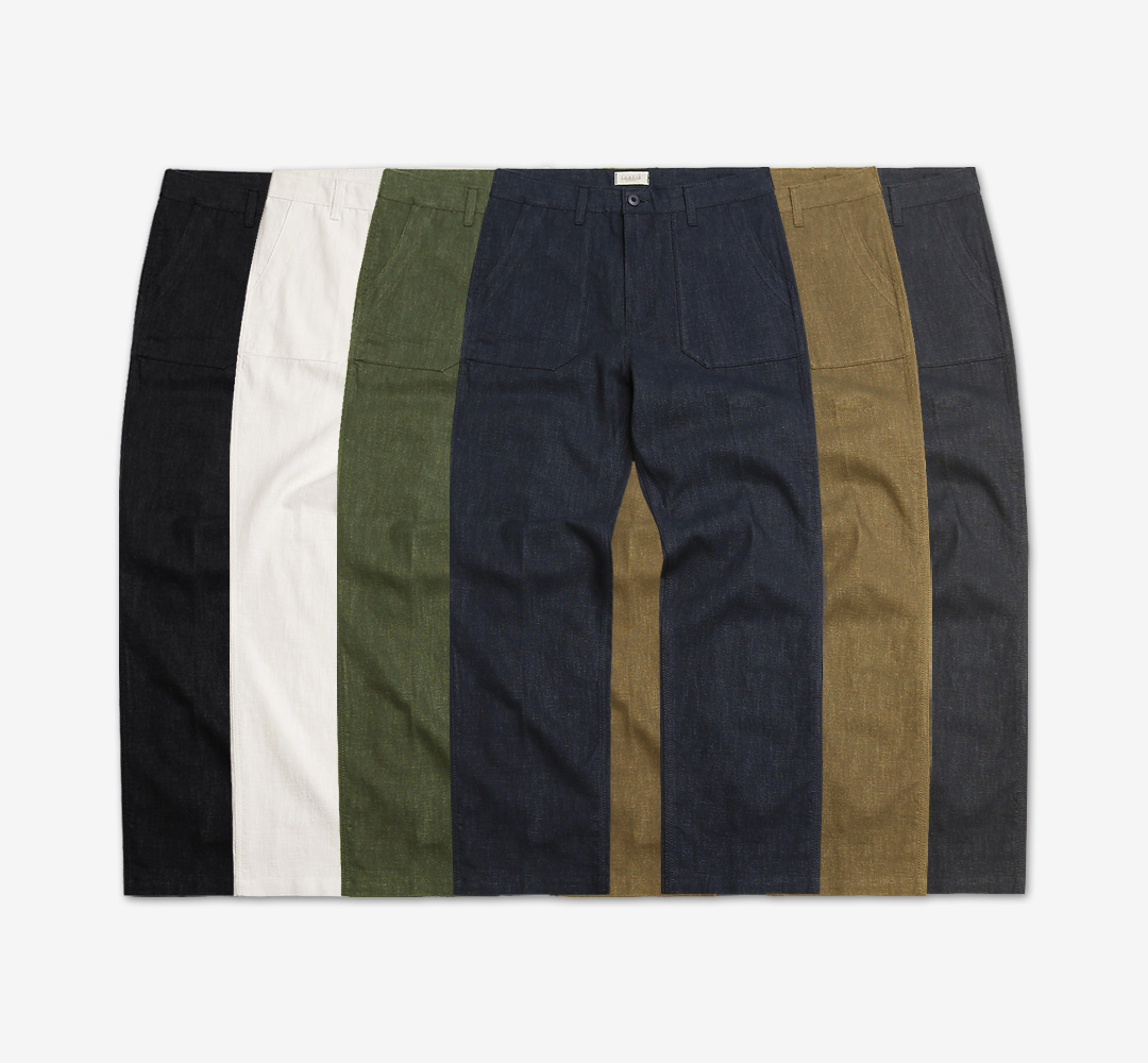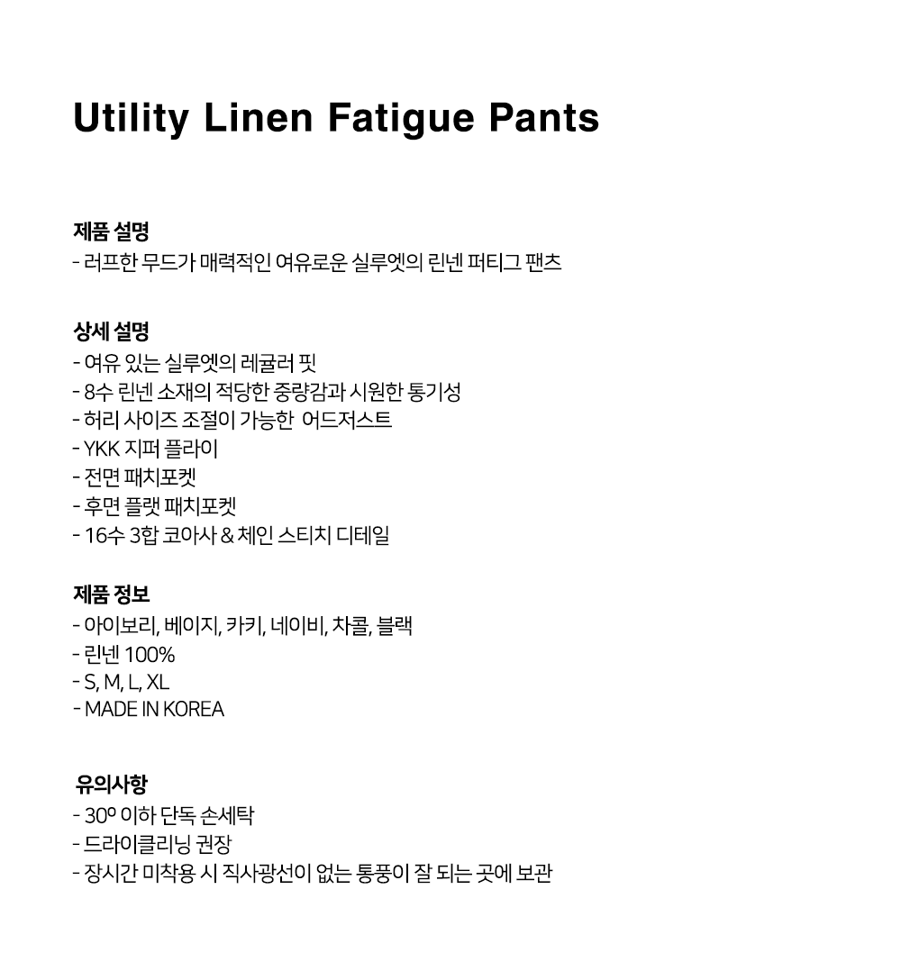 러프한 무드가 매력적인 여유로운 실루엣의 린넨 퍼티그 팬츠