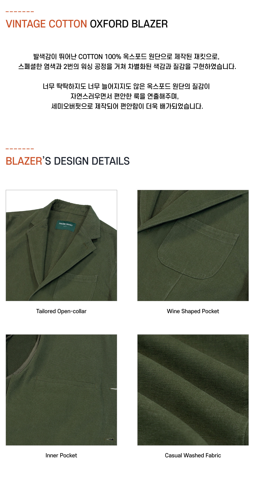 발색감이 뛰어난 COTTON 100% 옥스포드 원단으로 제작된 재킷으로, 스페셜 한 염색과 2번의 워싱 공정을 거쳐 차별화된 색감과 질감을 구현하였습니다.