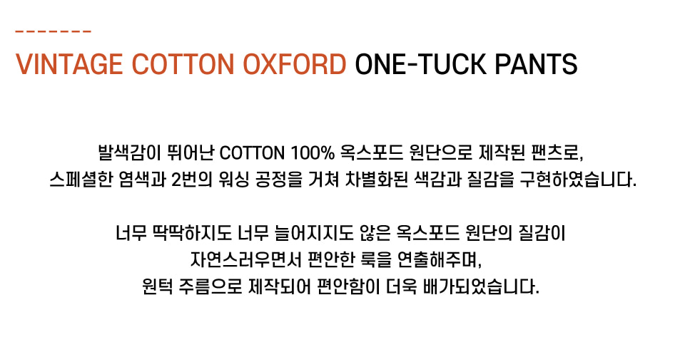 너무 딱딱하지도 너무 늘어지지도 않은 옥스포드 원단의 질감이 자연스러우면서 편안한 룩을 연출해 주며, 원턱 주름으로 제작되어 편안함이 더욱 배가되었습니다.