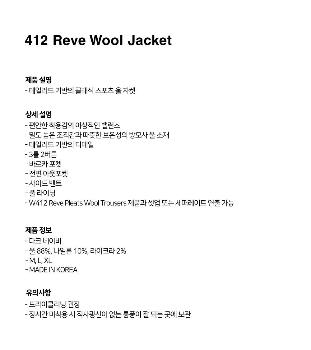 - W412 Reve Pleats Wool Trousers 제품과 셋업 또는 세퍼레이트 연출 가능
