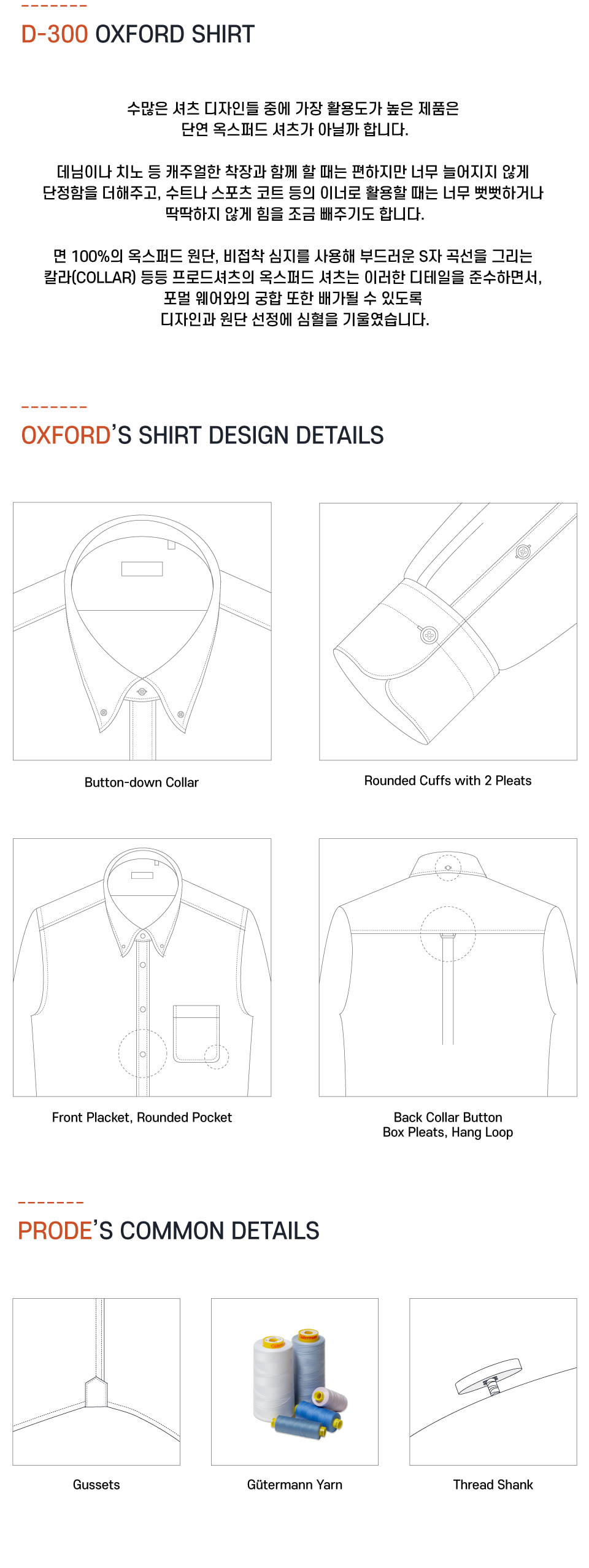 수많은 셔츠 디자인들 중에 가장 활용도가 높은 제품은 단연 옥스포드 셔츠가 아닐까 합니다. 데님이나 치노 등 캐주얼한 착장과 함께 할 때는 편하지만 너무 늘어지지 않게 단정함을 더해주고, 슈트나 스포츠 코트 등의 이너로 활용할 때는 너무 뻣뻣하거나 딱딱하지 않게 힘을 조금 빼주기도 합니다. 면 100%의 옥스포드 원단, 비접착 심지를 사용해 부드러운 S자 곡선을 그리는 칼라(COLLAR) 등등 프로드셔츠의 옥스포드 셔츠는 이러한 디테일을 준수하면서, 포멀 웨어와의 궁합 또한 배가될 수 있도록 디자인과 원단 선정에 심혈을 기울였습니다.
