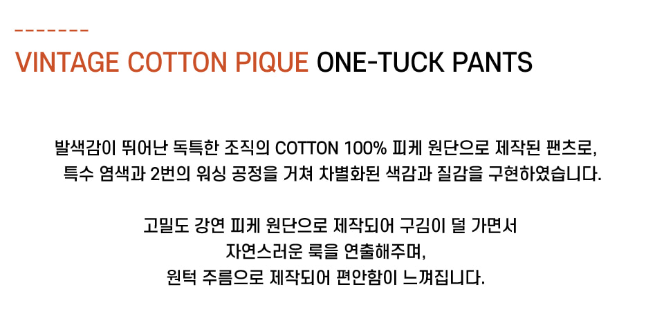 깊은 색감을 지닌 고밀도의 COTTON 100% 옥스포드 원단으로 제작된 팬츠로, 가먼트 워싱 공정을 거쳐 내추럴하고 편안한 룩을 완성하였습니다.